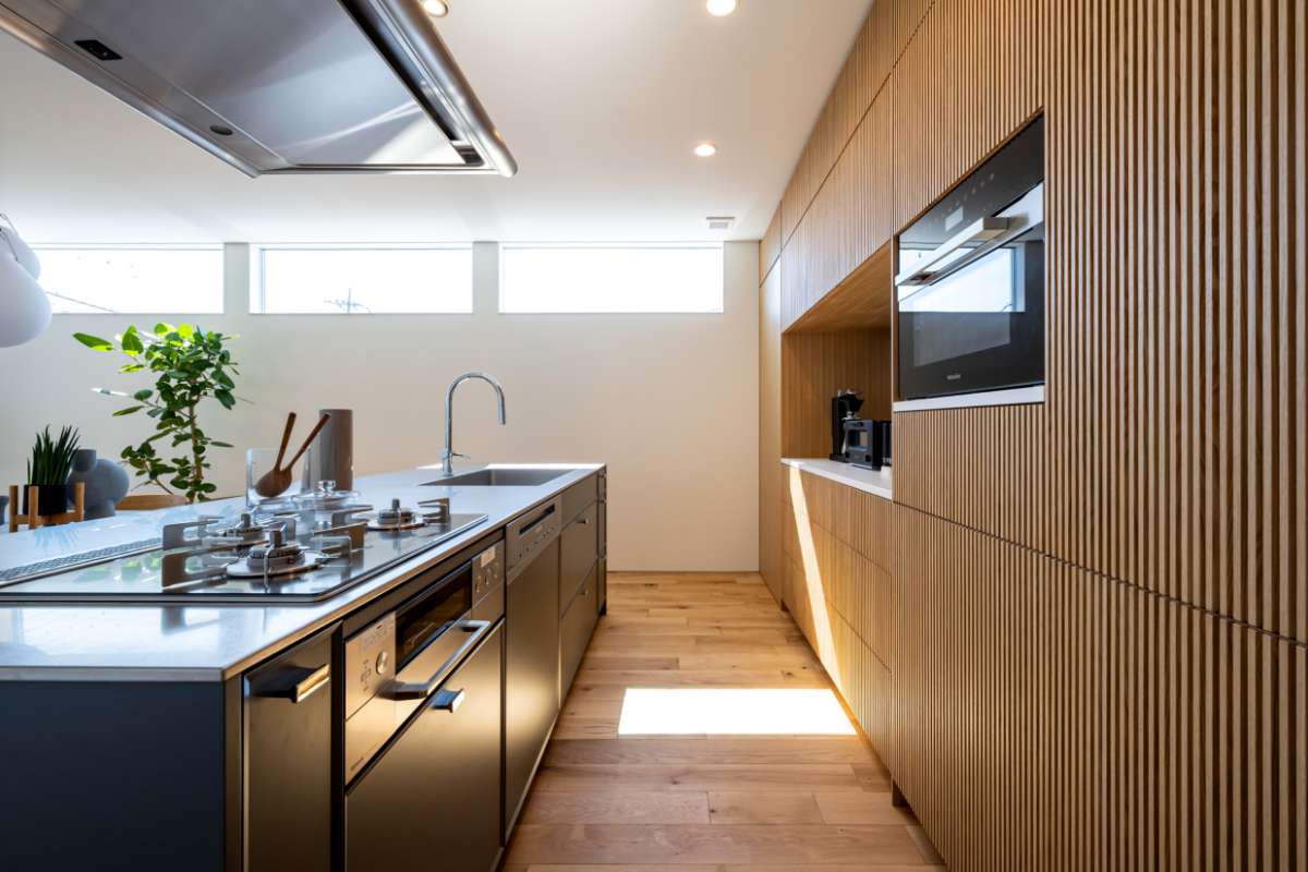 ドイツのプレミアムブランド ミーレの食洗機やオーブンをビルトインした機能美溢れるキッチン空間。シンプルながらも細部の美しさが際立つデザイン。