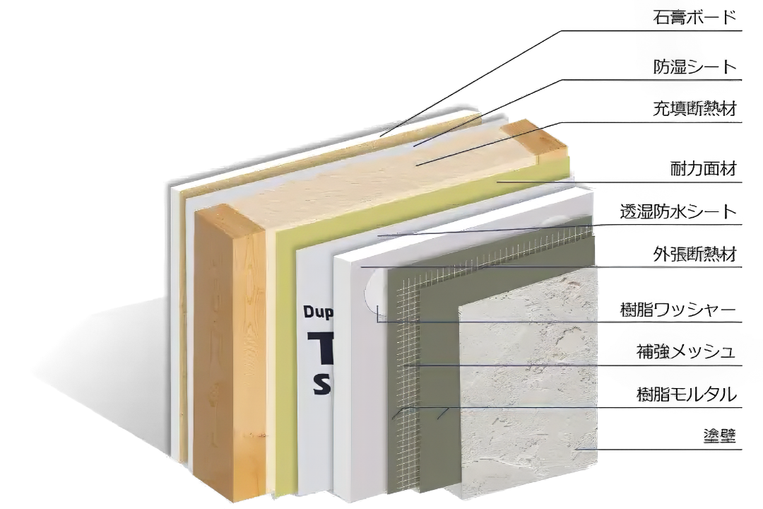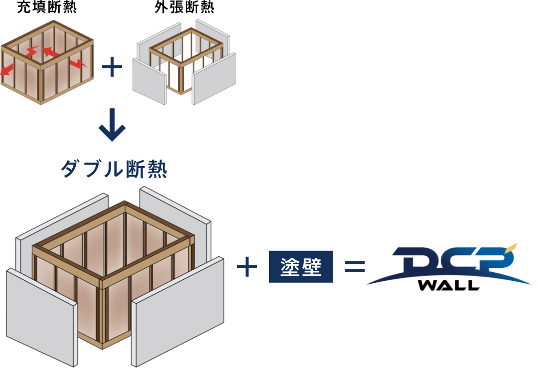 DCP WALLは、室内に夏の熱気や冬の冷気が入る前に建物を丸ごと外気から遮断してしまう「外張断熱」と、柱の間に断熱材を充填する「充填断熱」を融合することで、断熱性能の高い「ダブル断熱」を実現しています。