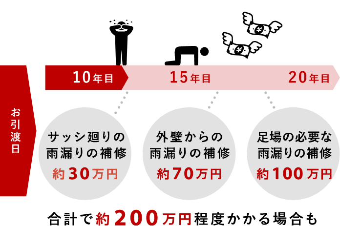 一般的なケースでは、60万円~90万円程度の補修費用が必要となります。場合によっては、200万円以上の補修費用がかかることもあります。当社では、お引き渡し後20年間、突然の不具合発生時にも、費用負担なく補修させていただきます。