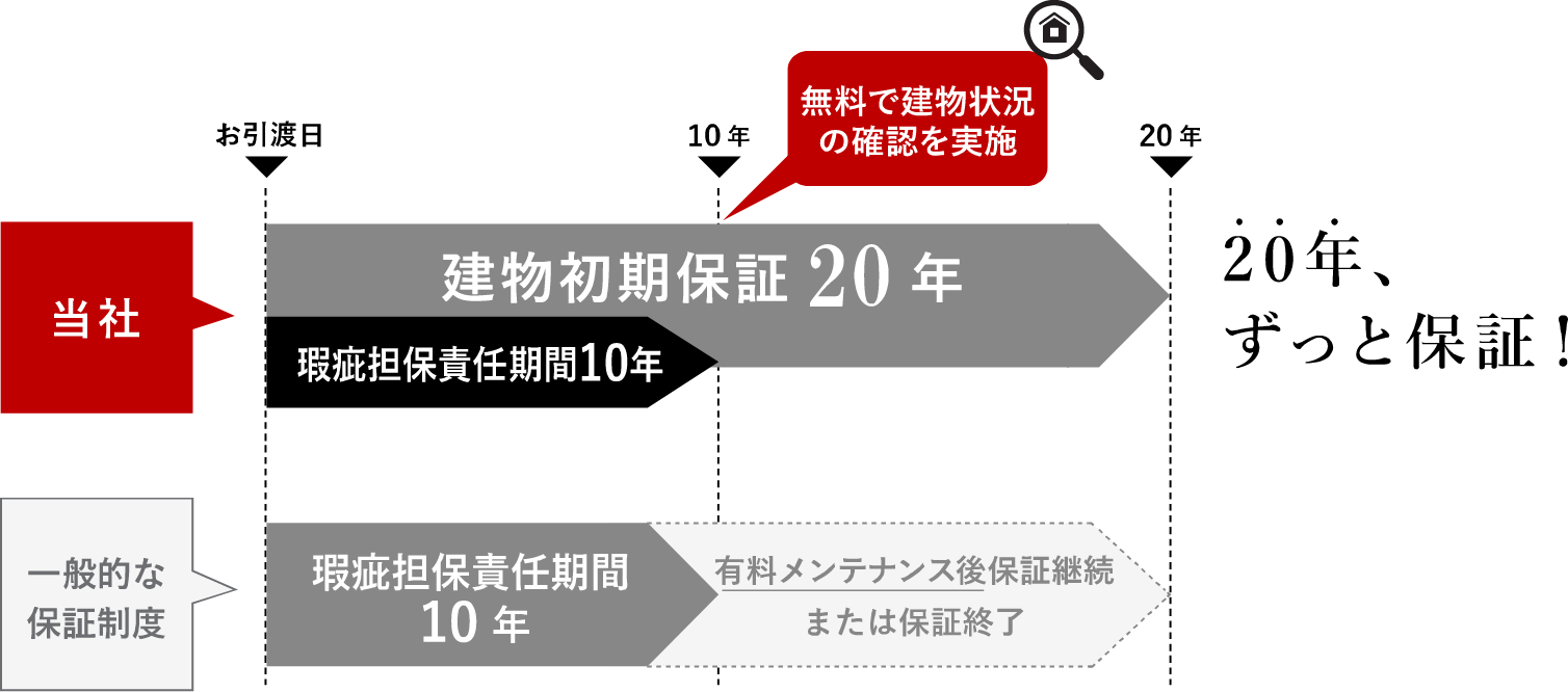 建物において重要な構造・防水の不具合の責任期間は、法律で10年と定められています。そのため、住宅会社の保証は10年間というのが一般的ですが、当社はお客様に長期の安心をご提供するために初期保証を20年間としております。