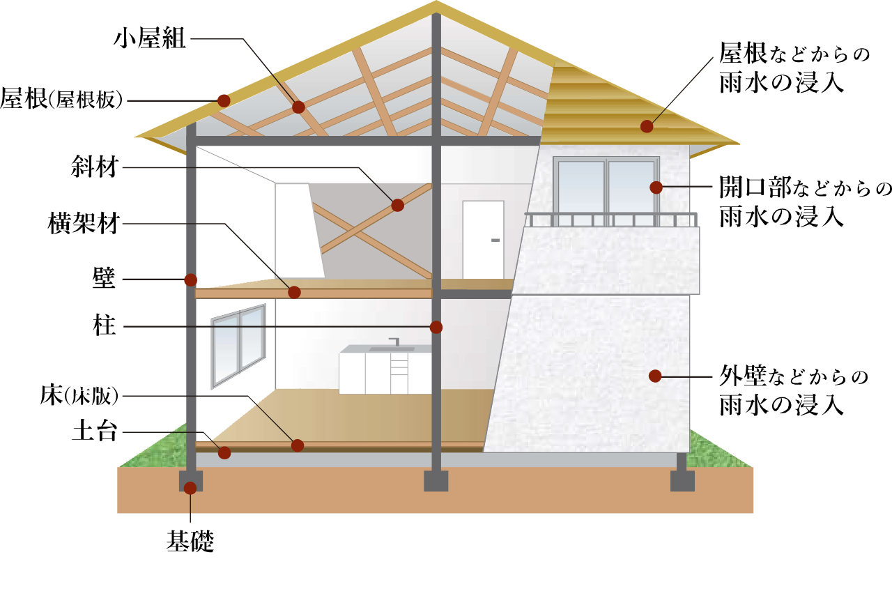 本サービスの対象となるのは、「構造耐力上主要な部分」「雨水の浸入を防止する部分」です。