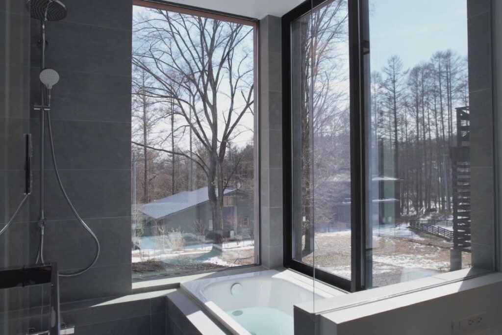 公園の木々を空間に取り込むピクチャーウィンドウのある家
