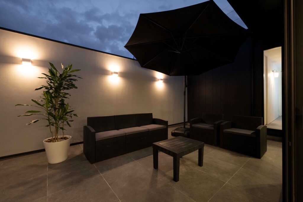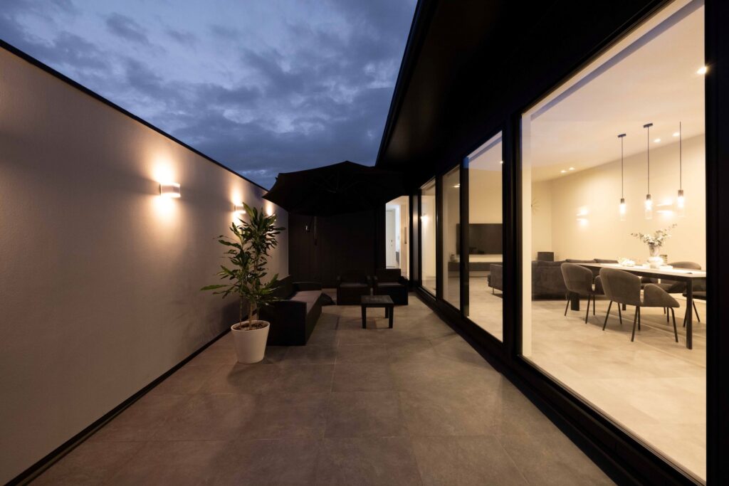 敷地形状を最大限に活かした中庭テラスを囲む平屋の家