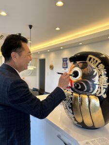 今年は会長の稲津と社長の穴原の2人にてだるまの開眼が行われました。