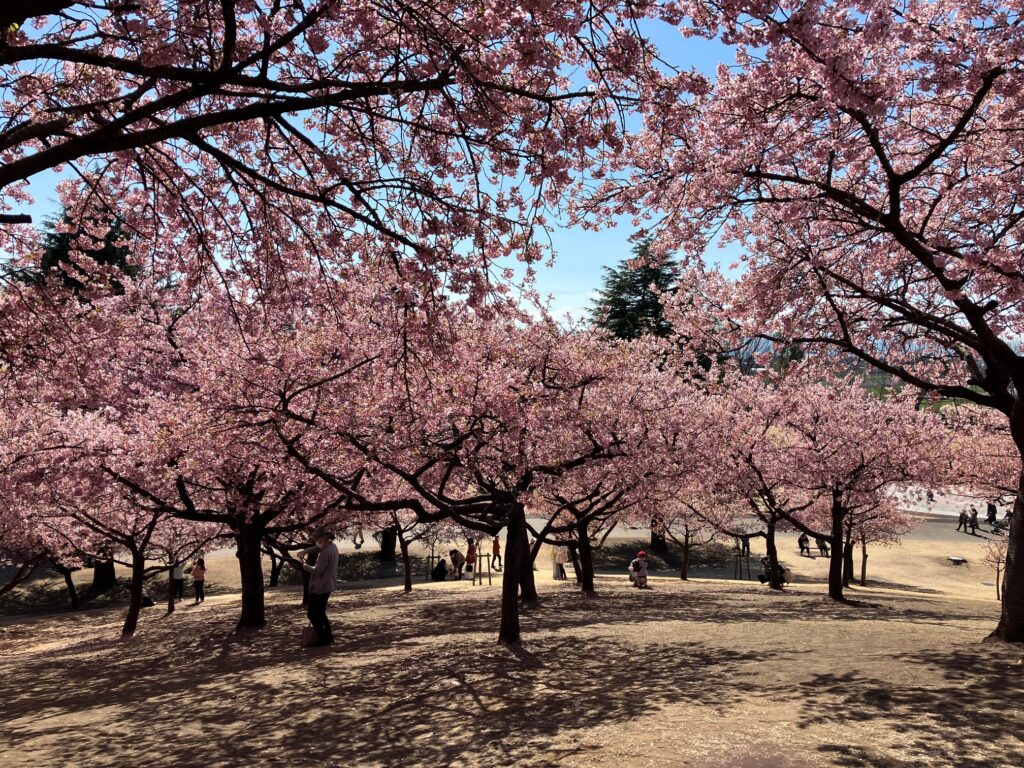 公園の南側に植えられた河津桜が見頃で、穏やか天気で多くの方が訪れていました。