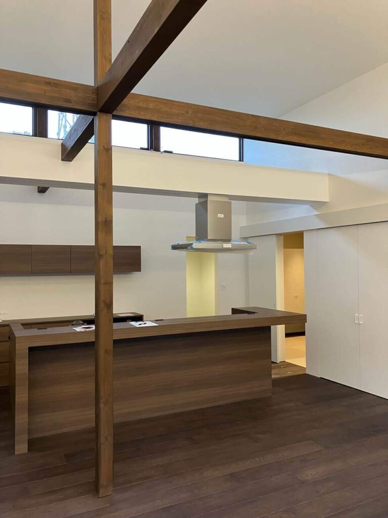 リビングは吹抜けでダイナミックな空間で、柱と梁が空間を引き締めた印象に仕上げています。