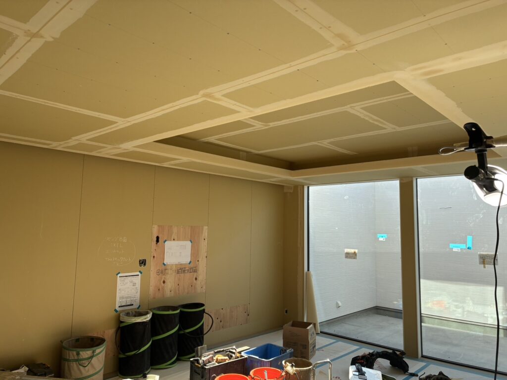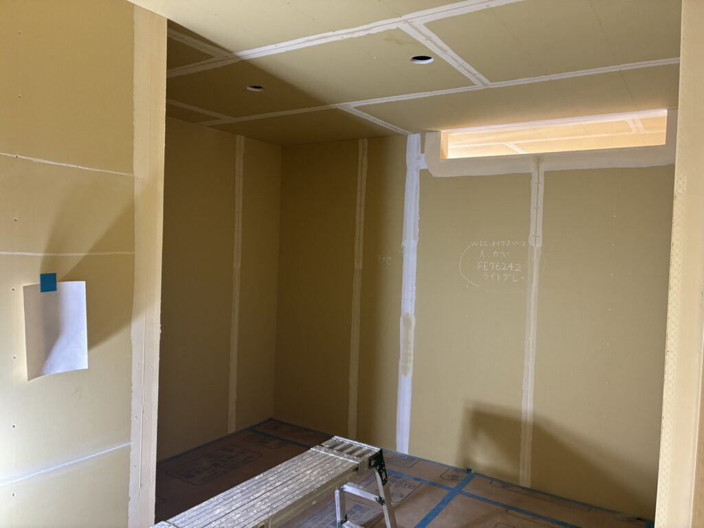 こちらは、クロスを貼る前に石膏ボードのジョイントやコーナー部分にパテ処理をし、平滑にしている状況です。クロスの貼り分けやどこまで貼るかなどを職人さんと打ち合わせをし、次の現場へ移動です。