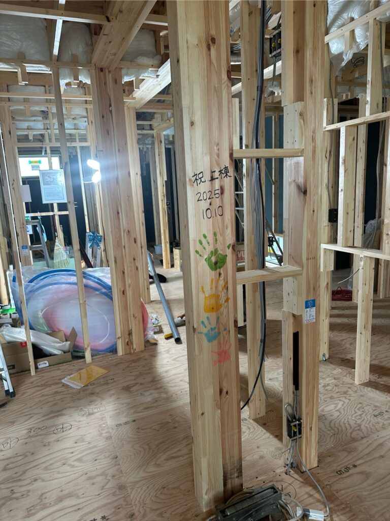 上棟のお祝いとして、柱にご家族皆さまの手形スタンプを押していただいたのですが、とても温かく素敵な瞬間を見せていただき、私自身も心がほっこりしました。