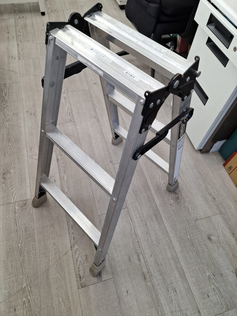 脚立を使用するときは完全に開いて開き止め金物を使用し