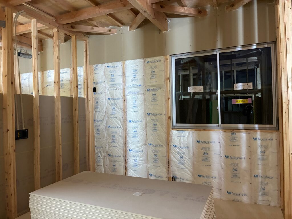 内部は電気配線工事、防火上主要な間仕切り壁の石膏ボード貼りがスタートしました!