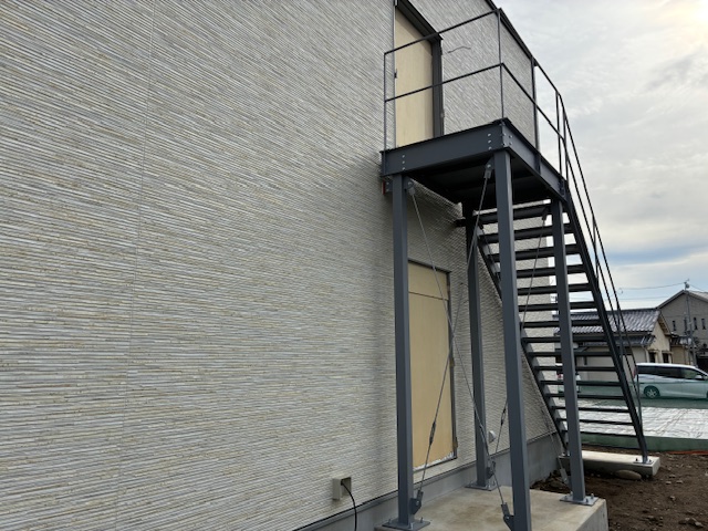 外部鉄骨階段設置・基礎巾木仕上げと工事が進んでいます。