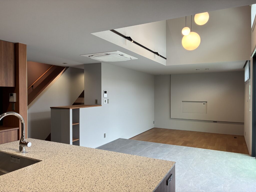 リビング吹き抜けやスキップフロア、たくさんの収納と家具の配置関係、2階ホールの書斎スペースなど、O様こだわりの素敵なお家に仕上がってます。