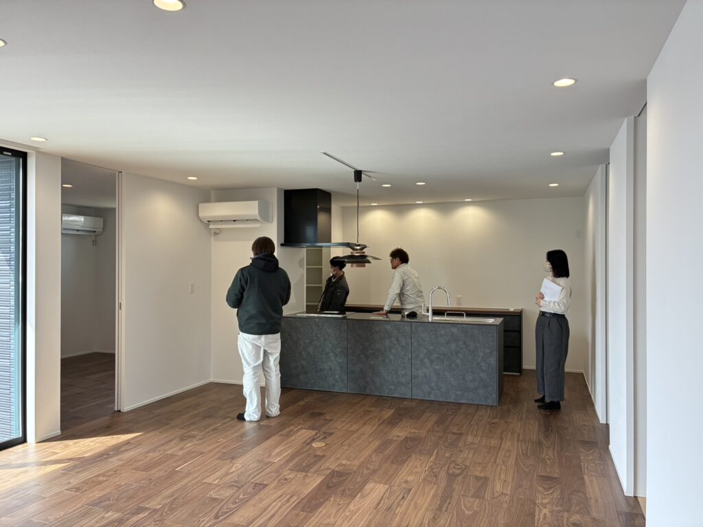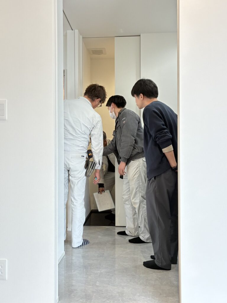 各部屋ごとに、内装(床・天井・壁)の仕上がり・サッシ網戸や室内建具関係・電気照明器具や設備機器・カウンターや収納内の棚などチェックリスをもとに問題ないか確認です。