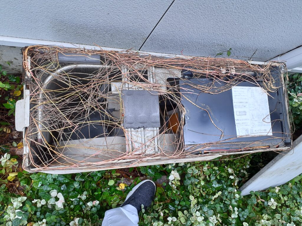 そのハツユキカズラがエアコンの室外機の周りに生えていて、つるが中に入っていたので室外機のカバーをはずしてみました。