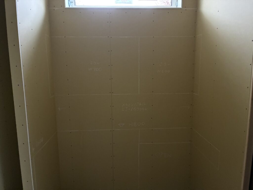 クロス工事の打合せでは違うクロスとの貼り分けや、家具・タイルなどに合わせどこまでクロスを貼るかなどを確認し、本日最後の現場へ向かいます。