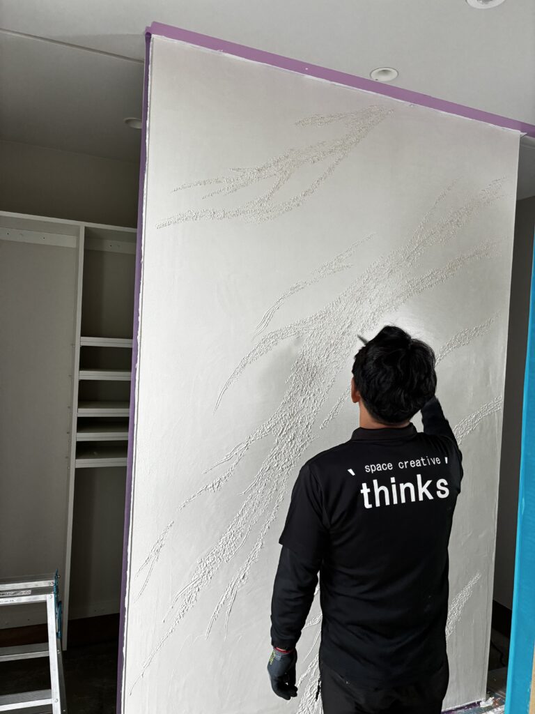 今回は玄関入ってすぐの壁だったので特に迫力のある壁になるよう全員で協議しながら模様を考えました。明日、色を付けて完成になります!完成をお楽しみに✨